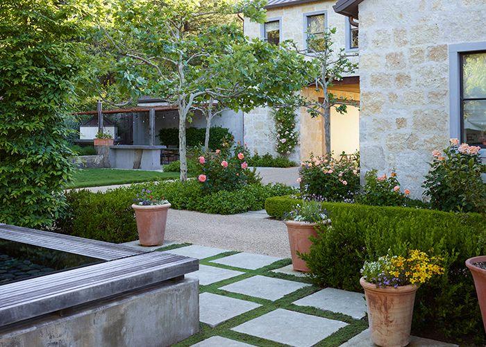 Grădina este plină de ghivece mari din teracotă, care adăpostesc diverse plante, de la ierburi aromatice, cum ar fi rozmarinul sau lavanda, până la alte plante perene ce adaugă diversitate. Lumina filtrată prin frunziș creează un joc de umbre și lumini pe pardoseala simplă, din piatră.
