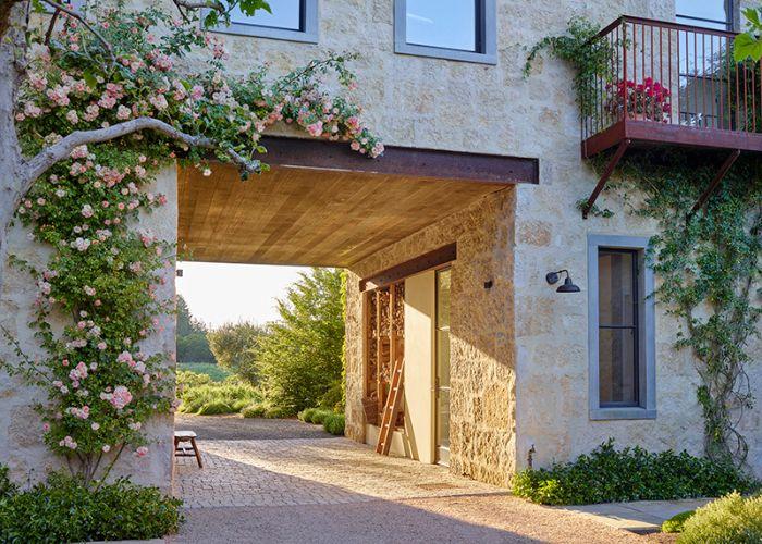 Plantele cățărătoare, în special un trandafir agățător cu flori delicate, de un roz pal, urcă pe un perete exterior, creând un arc natural ce încadrează intrarea. Această abundență de flori adaugă o notă de prospețime, romantism și un parfum subtil, transformând zona într-un spațiu primitor și plin de viață.