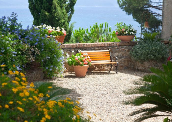 Imaginea surprinde un colț idilic al unei grădini mediteraneene, unde peisajul pare să se contopească cu orizontul infinit al mării. Această amenajare este un exemplu excelent de grădină intimă și relaxantă, concepută pentru contemplare și odihnă.