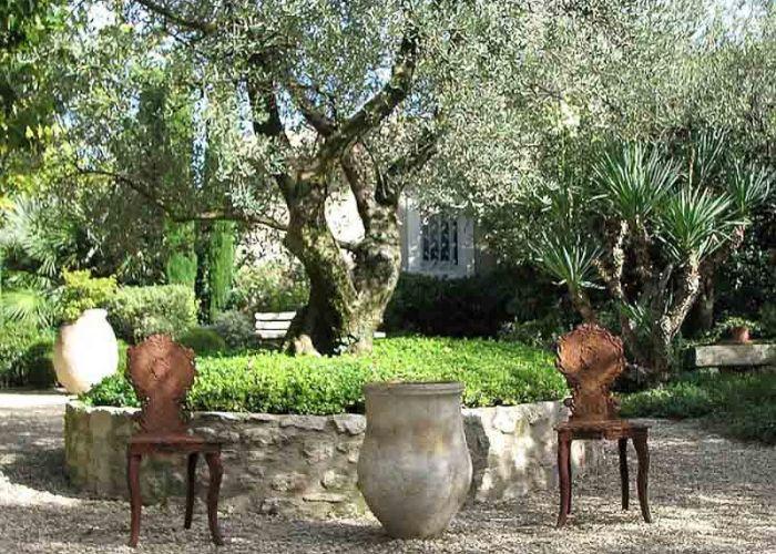Imaginea surprinde un colț de grădină mediteraneană cu o estetică profund rustică și atemporală, care amintește de peisajele din Provence. Întregul spațiu este dominat de un sentiment de calm și autenticitate, creat prin îmbinarea elementelor naturale cu detalii atent alese.