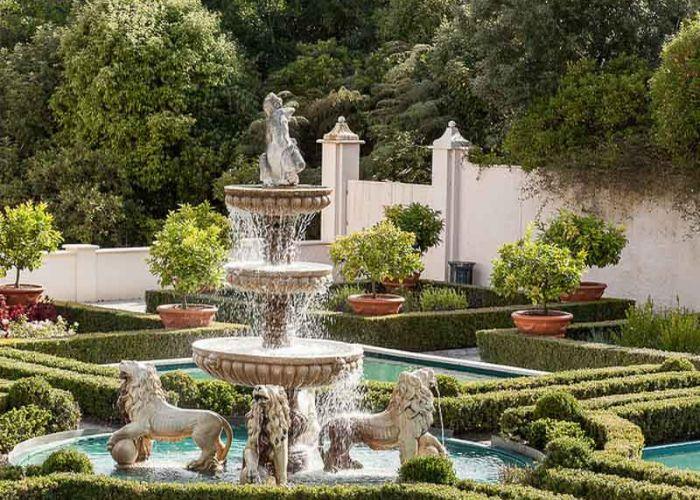 Punctul focal al amenajării este fântâna monumentală, cu mai multe niveluri și bazine, împodobită cu sculpturi de lei care varsă apă. Aceste statui, cu o alură nobilă, aduc o notă de grandoare și eleganță. Sunetul apei curgătoare creează o atmosferă de calm și prospețime, esențială într-o grădină mediteraneană.